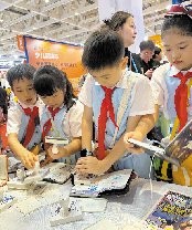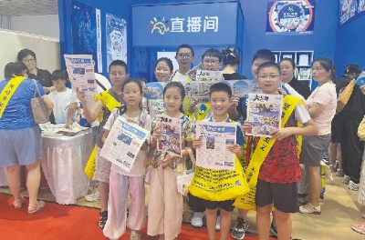 展位上,参观者摩肩接踵。据统计,书博会期间,近万人次走进了《阳光少年报》展位。