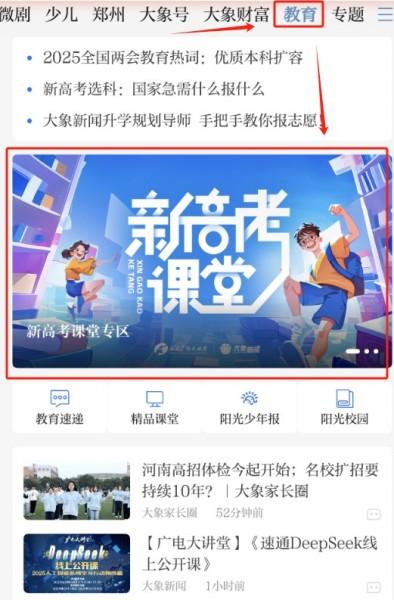点击大象新闻“教育频道”入口,轮播图页面点击“新高考”课堂,可观看往期重点直播内容。