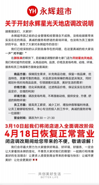 永辉超市开封星光天地店自3月10日起,在借鉴胖东来模式的基础上闭店开启全面调改。历经近40天升级,该店将于4月18日正式恢复营业,同时这也是永辉在河南落地的第七家“胖改”门店。