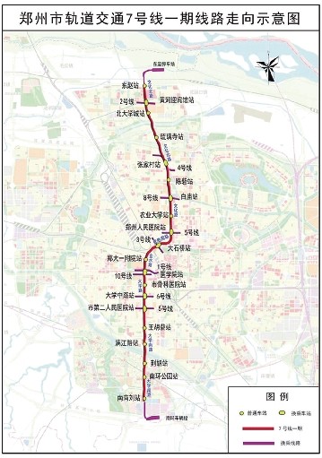 7号线一期为郑州市中心城区的一条南北向加密线,建设线路起于东赵站止于南岗刘站,建设线路全长约26.8km,均为地下线,全线共设车站20座。其中换乘站8座,分别与1号线和10号线在医学院站换乘、与2号线在黄河迎宾馆站换乘、与3号线在大石桥站换乘、与4号线在张家村站换乘、与5号线在郑州人民医院站和市第二人民医院站换乘、与在建6号线一期东北段在大学中路站换乘、与在建8号线在白庙站换乘。