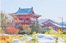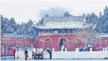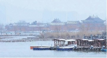 龙亭公园内,巍峨的宫殿在雪中屹立,金色的琉璃瓦与白雪相互辉映。登上龙亭,俯瞰整个开封城,白雪皑皑,美不胜收。