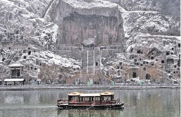 龙门石窟在白雪的覆盖下,显得更加庄严肃穆。那些栩栩如生的佛像,披上了一层银装,仿佛在诉说着千年的故事。卢舍那大佛微笑着俯瞰大地,雪花落在她的肩头,增添了一份圣洁与宁静。