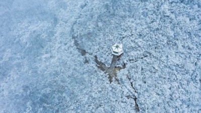 冬日的龙湖,湖水静谧,湖面上结了一层薄薄的冰。湖边的芦苇在寒风中摇曳,雪花落在上面,犹如白色的绒花。
