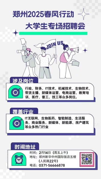 为促进郑州地区大学生就业,由郑州市金水区人力资源和社会保障局、金水区人民路街道办事处联合52就业网举办的“郑州2025春风行动大学生专场招聘会”将于2月14日(周五上午)在郑州新华中州国际饭店五楼举办。