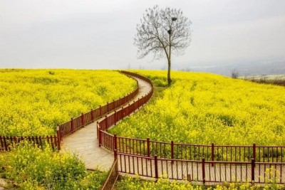 襄城县的万亩油菜花海,金浪翻滚,与古朴的村落相映成趣,勾勒出田园牧歌的浪漫。