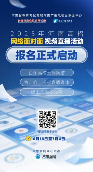 2025年河南高招“网络面对面”视频直播活动由河南省教育考试院和河南广播电视台联合举办,由河南广播电视台大象新闻具体承办,确保所有信息真实、权威,为考生志愿填报保驾护航!