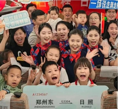 为了给旅客旅途增添欢乐,营造美好的乘车环境,该车队精心布置了车厢,“坐上高铁去日照,碧海金沙等你哦,朝饮胡辣汤午尝海鲜宴,郑州的城日照的海,一场说走就走的旅行。”旅客拍照打卡欣喜不止。